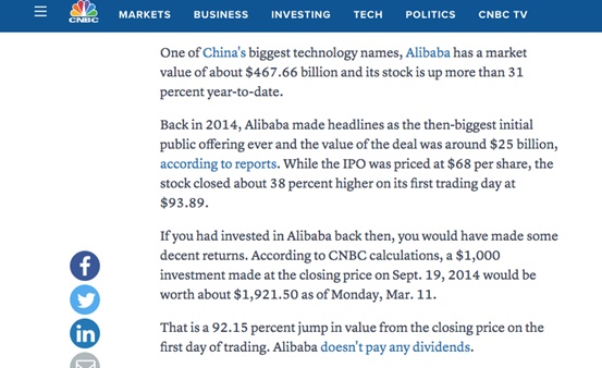 阿里巴巴的股票今年以来上涨超过31%,如果从阿里上市的第一天开始计算,其近五年的投资回报率超过92%