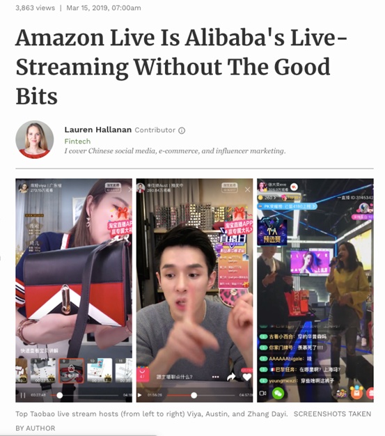 福布斯发布专栏作者Lauren Hallanan撰写的文章。作者认为,淘宝直播探索的经验,给亚马逊提供了很多参考