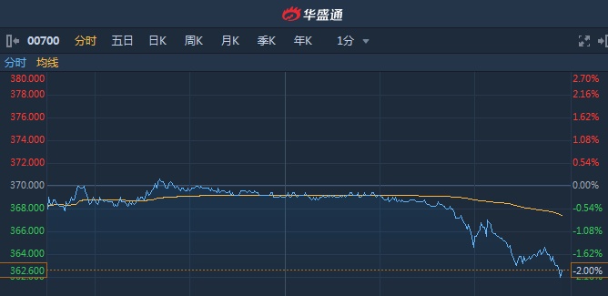 智通财经APP获悉,尾盘买卖盘交易剧烈,腾讯控股(00700)现大手卖出4万股,成交价363.0港元,涉资1452万港元。此外,该股将于今日盘后公布年度业绩,截至15时54分,跌2%,报362.6港元,成交额69.25亿。