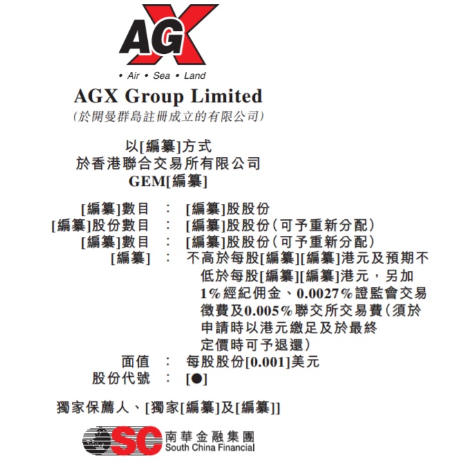 AGX集团有限公司的总部设于马来西亚,是一间综合物流服务供应商,集中于空运代理服务。其最大的客户为于马来西亚证交所主板上市的领先低成本航空营运商,于往绩记录期间为该集团的收益总额贡献分别约24.9%、22%及32%。