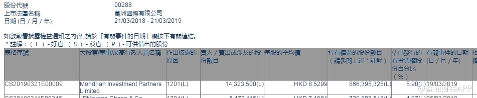 智通财经APP获悉,根据联交所资料显示,Mondrian Investment Partners Ltd于3月19日减持万洲国际(00288)1432万股,每股作价8.5299港元,总值1.22亿港元,最新持股数减至8.66亿股,最新持股比例减至5.90%。