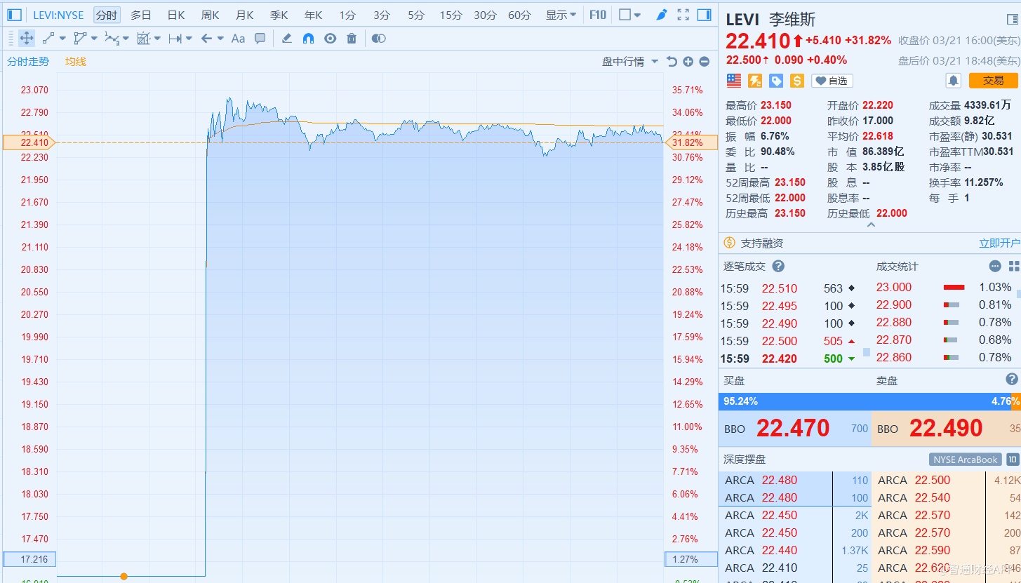 李维斯上市首日高开30%,收盘涨31.82%,报22.41美元,市值达到86.39亿美元。