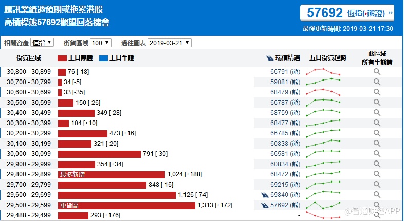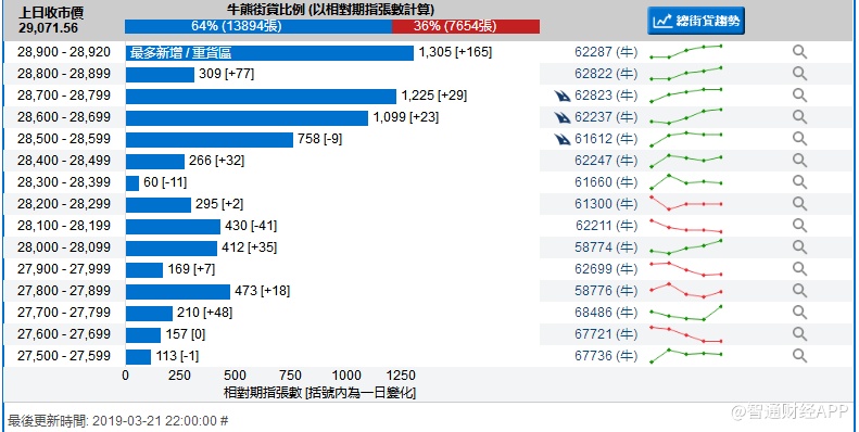 智通财经APP获悉,截至3月21日,恒指最新的牛熊街货比例64:36。从瑞信恒指牛熊证街货分布图中得到的数据显示,熊证街货重货区在29500-29599区间,该区间最新熊证数量为1313张,较上一交易日增加172张;最多新增区间在29800-29899区间。牛证街货重货区在28900-28920区间,该区间最新牛证数量为1305张,比上一交易日增加165张;最多新增也在该区间。