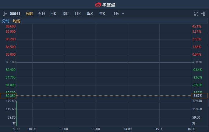 智通财经APP获悉,中国移动(00941)昨日公布业绩后跳水大跌近5%,今日早盘再度低开,截至9时20分,跌3.67%,报80.5港元,成交额达1.44亿港元。