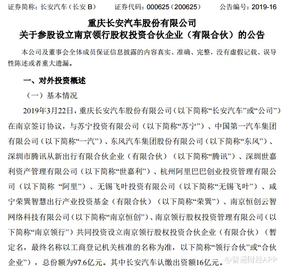 智通财经APP获悉,长安汽车发布公告称,3月22日,苏宁投资有限公司与一汽、东风汽车、长安汽车、腾讯(00700)、世嘉利、阿里(BABA.US)等公司共同出资组建南京领行股权投资合伙企业(有限合伙)。
