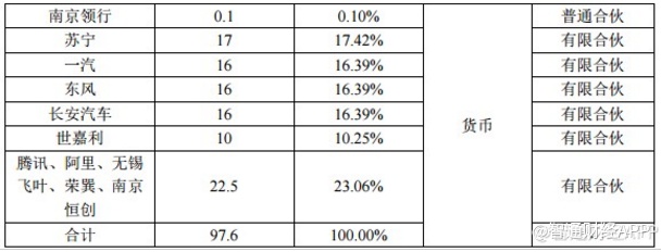 该合伙公司注册资本为1000万,总出资额为97.6亿元。腾讯、阿里、无锡飞叶、荣巽及南京恒创共认缴出资数额22.5亿,投资占比为23.06%。该合伙公司拟投资以新能源汽车为主的共享出行产业,组建出行公司,不从事其他业务。出行公司由一汽集团、东风汽车集团、兵装集团三家央企联合互联网、金融、零售等行业头部公司共同出资设立。