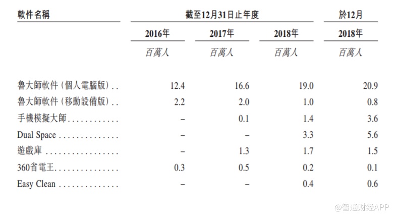 根据弗若斯特沙利文,截至2018年12月31日止年度,就用户基础而言,360鲁大师是中国最大的个人电脑及智能手机硬件和系统评测及监控解决方案供应商,基于个人电脑及移动设备每月活跃用户市场份额分别为98.8%及58.9%。于2018年12月,该公司产品的每月活跃用户约为113.6百万人,包括工具软件的每月活跃用户105.9百万人及游戏库的每月活跃用户7.7百万人。