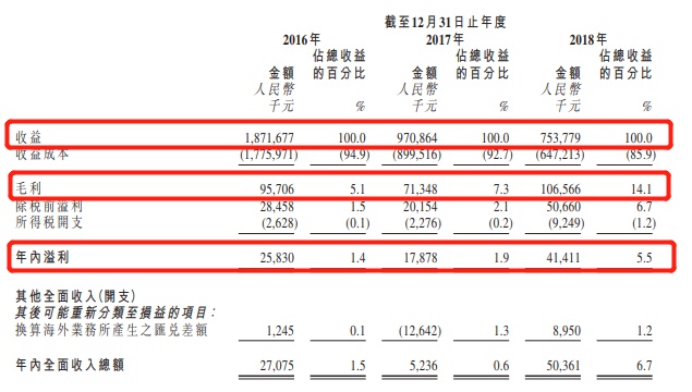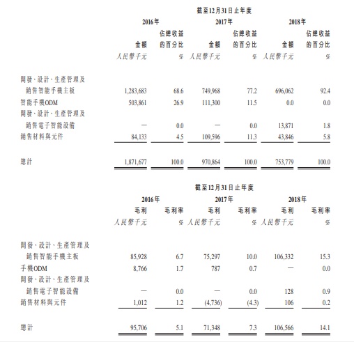 据招股书显示,该公司的总收益由截至2016年12月31日止年度的约人民币18.72亿元跌48.1%至截至2017年12月31日止年度的约9.71亿元,主要由于手机ODM及主板业务的收益减少所致。进一步下跌22.4%至截至2018年12月31日止年度的约7.54亿元。截至2018年12月31日止三个年度各年,年内溢利约为人民币2583万元、1787.8万元及4141.1万元。
