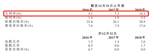 截至2018年12月31日止三个年度各年,该公司的毛利分别约为人民币9570.6万元、7134.8万元及人民币1.06亿元;而该公司的整体毛利分别为5.1%、7.3%及14.1%。该公司的毛利率取决于多种因素共同影响,包括其产品的销量、产品的价格、原材料成本。