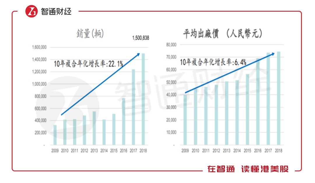 汽车公司的成长还是要靠销量的增长,从吉利近十年的销量看,增速非常稳健,不过2014年吉利的销量回落,但之后增速加快,平滑下来,近10年该公司的销量复合增速22.1%,而近五年复合增速达37.7%。从单台车价格看,该公司近十年平均出厂价复合增长率6.4%,2018年平均单台车价约7.44万元。