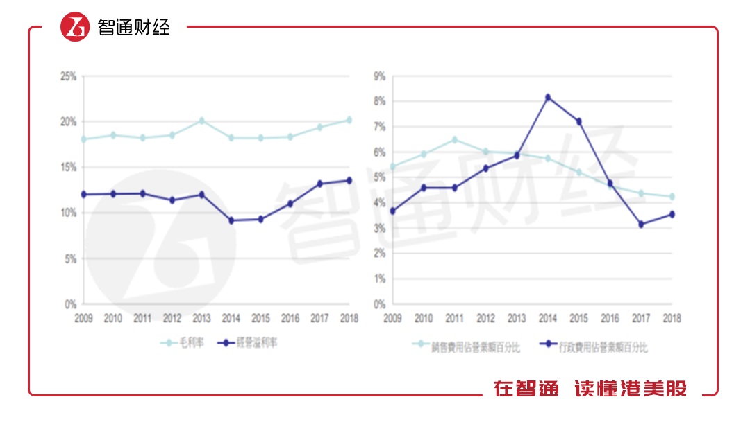 上文主要阐述了吉利收入增长、销量增长、具体车型销量以及市场情况,但只能说明该公司的成长条件,在盈利上,还得谈到毛利率和净利率。智通财经APP了解到,2018年吉利的毛利率和经营利润率都有提高。从过往年份看,近五年这两个盈利指标均逐年提高,而费用率,包括销售费用率和行政费用率呈明显下滑趋势。