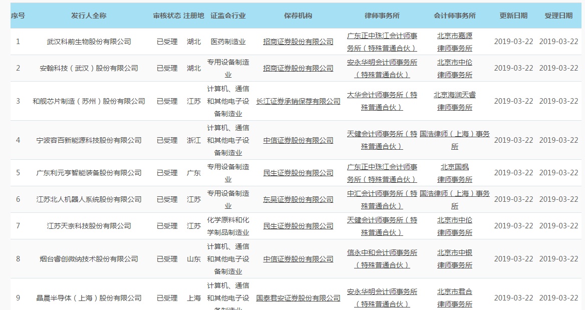 智通财经APP获悉,今天下午,上交所公布9家科创板受理企业,分别为晶晨半导体、睿创微纳、天奈科技、江苏北人、利元亨、宁波容百、和舰芯片、安瀚科技,武汉科前生物。