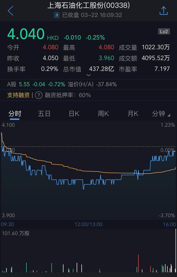 截至今日收盘,上海石油化工(00338)跌0.25%,报4.04港元。