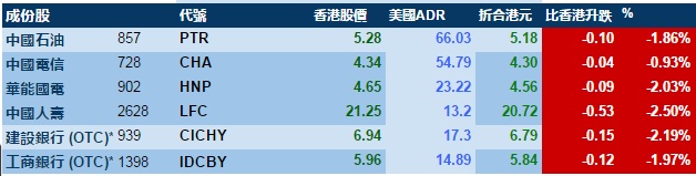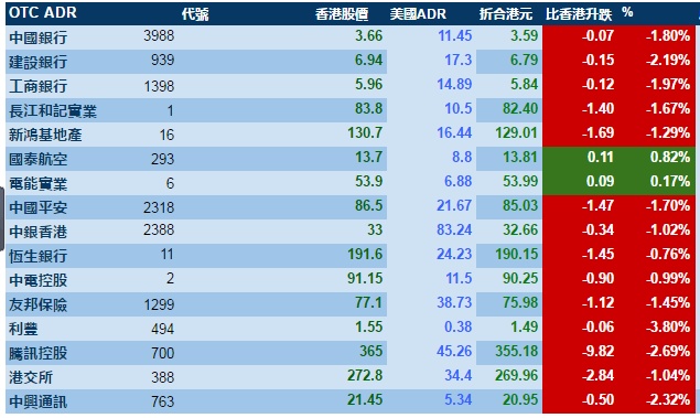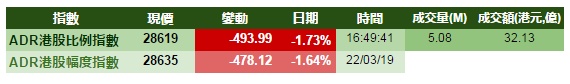 智通财经APP获悉,隔夜港股ADR比例指数跟随美股大跌,收报28619点,跌493点或1.73%。大型蓝筹全线下跌,汇丰控股比香港跌1.31%,折合报63.44港元。腾讯控股跌近10元,折合报355.19港元;港交所跌2.84元至269.96港元。