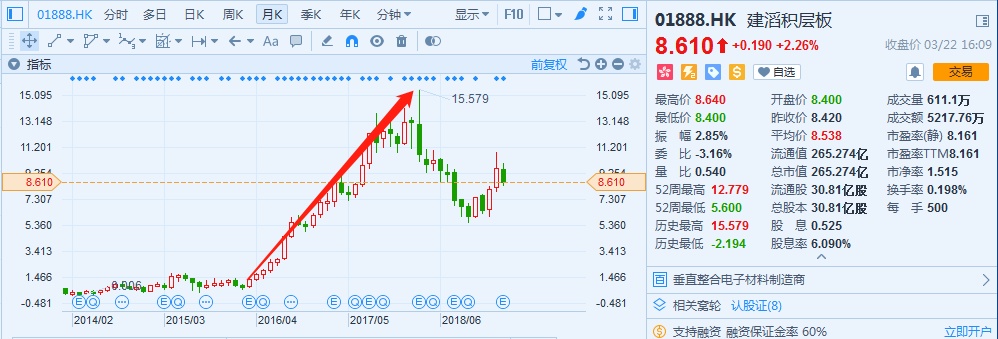 抓住了行业发展机遇的建滔积层板实现了“鱼跃龙门”,股价从2016年3月中旬的2.4港元涨至2018年的最高点15.09港元,短短3年时间,股价翻6倍。