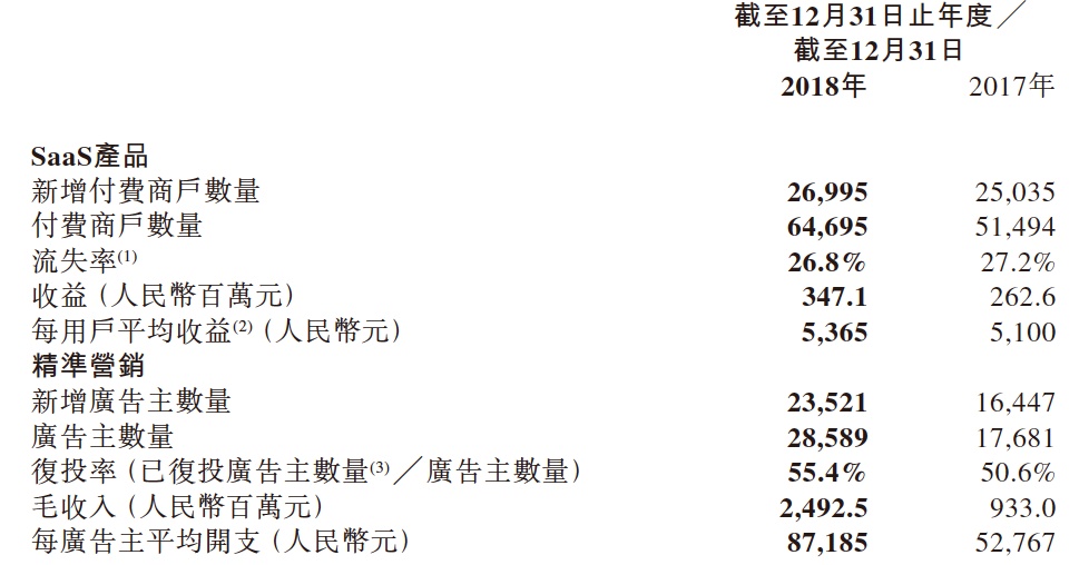 此外,其精准营销业务毛收入达24.93亿元人民币,同比增长167%;营收达5.18亿元人民币,同比增长90.9%。相同于SaaS产品,精准营销的广告主数量、复投率及ARPU均获得了大幅增长。