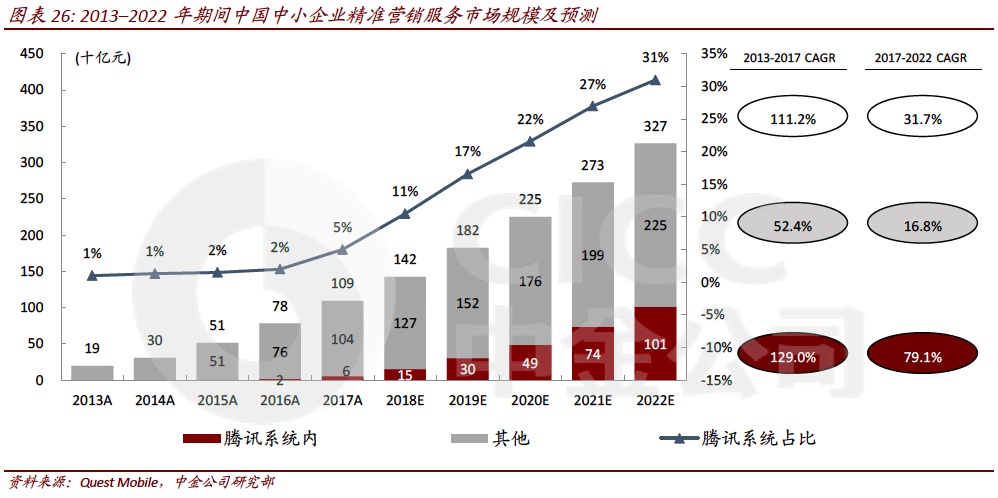根据Frost & Sullivan预测,在2018年-2022年期间,中国中小企业精准营销服务市场规模的年复合增速有望维持在24.6%的较高水平。而腾讯系统的中小企业精准营销市场规模的年复合增速则有望维持在79.1%。
