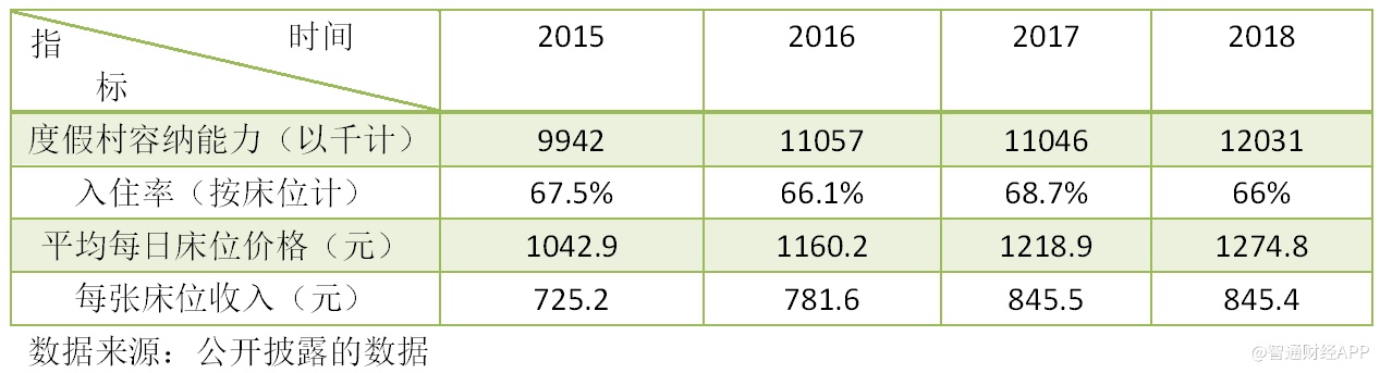 从运营数据上看,该公司的度假村容纳能力逐年提升,2015年以来复合增长率6.6%,2018年容纳能力同比增长8.9%,增速有所提高。此外,2018年该公司的平均每日床位价格和每张床位收入较2015年均有较大提升,而入住率稳定在66%的水平,仍有较大的提升空间。