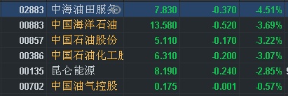 智通财经APP获悉,石油股早盘全线下挫,截至发稿,中海油田服务(02883)跌4.51%,中海油(00883)跌3.69%,中石油(00857)跌3.22%,中石化(00386)跌3.07%。