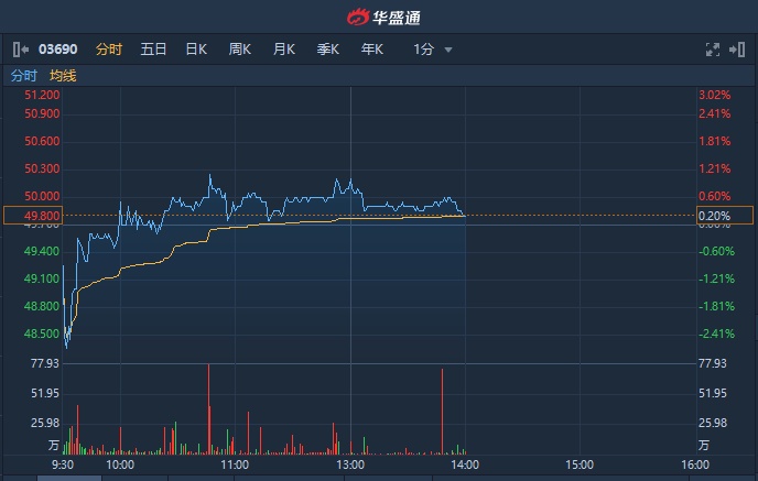 智通财经APP获悉,美团点评-W(03690)盘中现3宗大手成交,每股作价50.10元,共涉及2,340万股,共涉资11.72亿元,股价低开高走,午后逆市飘红,截至13时59分,涨0.2%,报49.8港元,成交额达16.98亿港元。