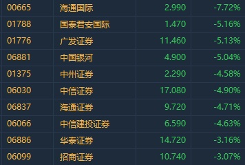 智通财经APP获悉,A股券商板块今日显著走弱,领跌两市,华林证券,长城证券跌超5%,港股中资券商股跟随下挫,截至发稿,海通国际(00665)跌7.72%,国泰君安国际(01788)、广发证券(01776)、中国银河(06881)跌超5%,中信证券(06030)、海通证券(06837)跌超4%。
