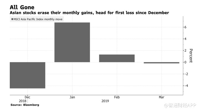 图:亚洲股市回吐月度涨幅,为自去年12月以来首次下跌。