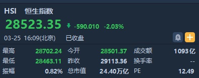 智通财经APP获悉,恒指早盘跳空低开2.1%失守二十日线,随后维持弱势震荡格局。截至收盘,恒生指数跌590.01点或2.03%,报28523.35点,全日成交额达1093.35亿。国企指数跌2.48%,报11232.07点,红筹指数跌1.52%,报4477.2点。