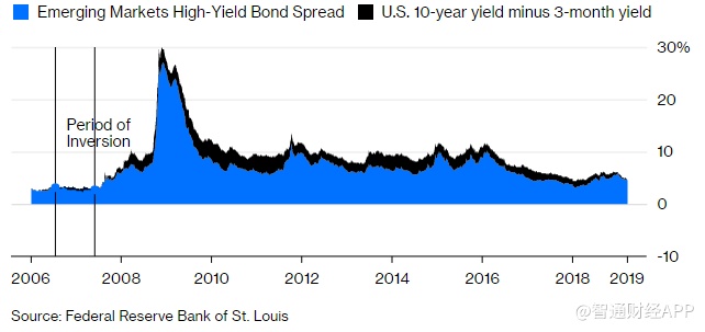 上一次美国收益率曲线发生倒挂时,新兴市场的高收益债券收益率利差几乎没有波动。