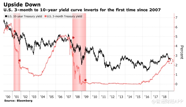 而现在,美国收益率曲线的倒挂或许给了投资者们一个放缓脚步的信号。上周五,3月期美债收益率高出10年期美债收益率,他们之间的息差在十多年来首次跌破零。在美国过去7次经济衰退中,均有过这种先兆,即使是1966年的一个错误信号也导致标普500指数进入熊市。