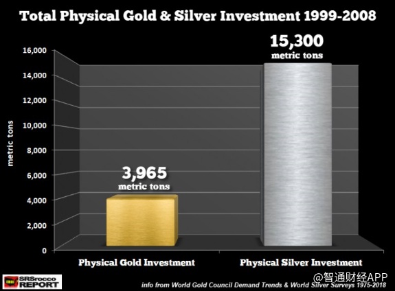 1999-2008年,全球黄金实物投资总量为3965吨,而白银为15300吨。