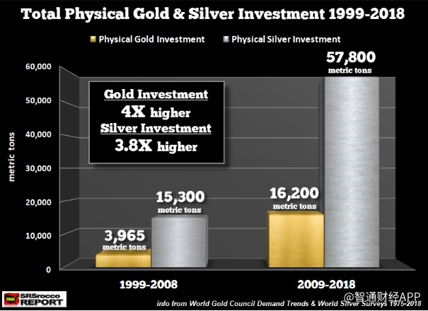 全球实物黄金投资增长4倍,而白银投资增长3.8倍(近4倍)。从1999-2008年,实物黄金的年均投资仅为396吨和1524吨,相比之下,2009-2018年,实物黄金投资为1187吨,白银投资为6090吨。