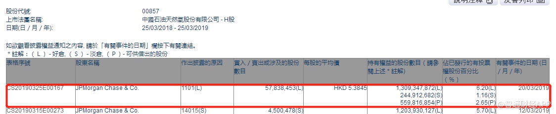 智通财经APP获悉,根据联交所资料显示,摩根大通于3月20日增持中国石油(00857)5783万股,每股作价5.38港元,总值约3.11亿港元,最新持股数目约13.09亿股,最新持股比例增至6.20%。