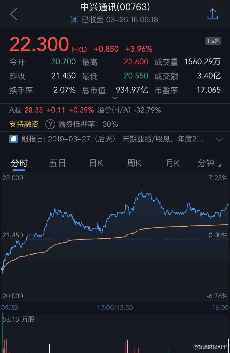 截至今日收盘,中兴通讯(00763)涨3.96%,报22.30港元。