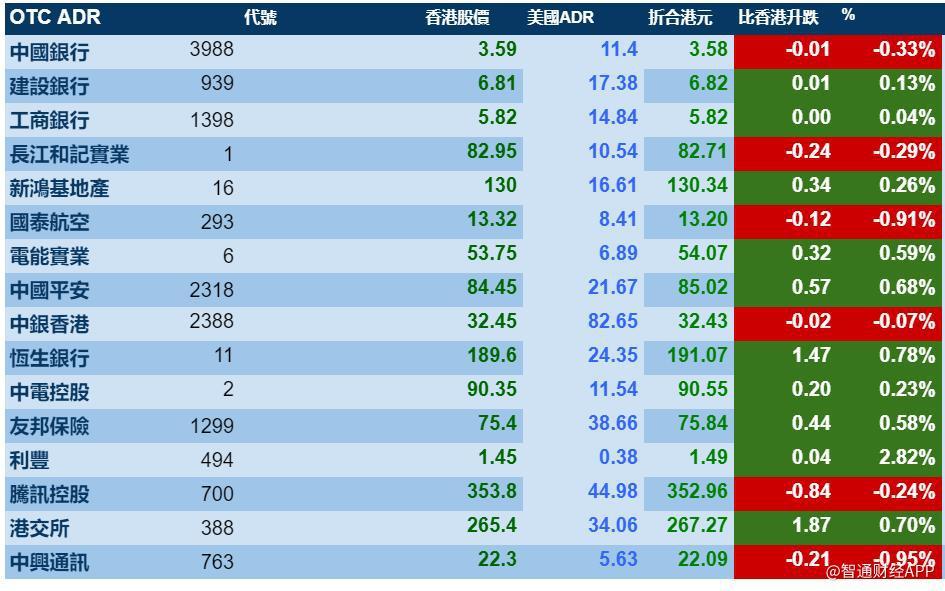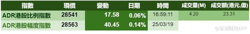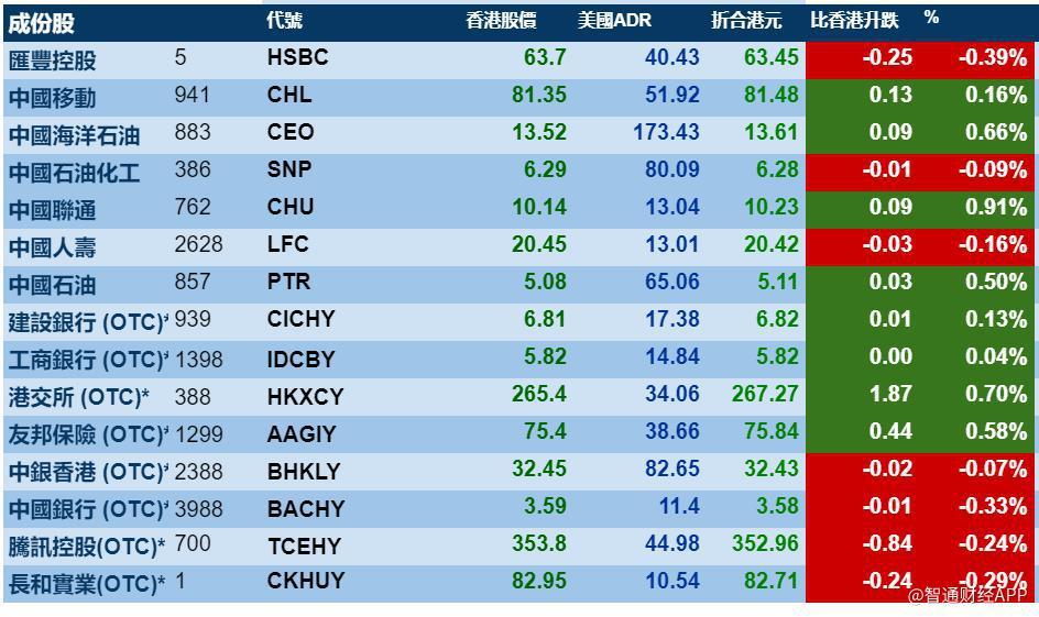 智通财经APP获悉,隔夜港股ADR比例指数上扬,收报28541点,升17.58点或0.06%。大型蓝筹升跌不一,汇丰控股收报63.45元,较港收市跌0.25元;腾讯控股收报352.96港元,下跌0.24%。