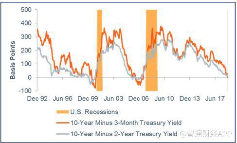 另一个令人担忧的迹象时,美国10年期国债收益率下滑至2.4%以下,与联邦基准利率(2.25%-2.5%)大致相同,但2年期国债收益率为2.24%,远低于基准利率。