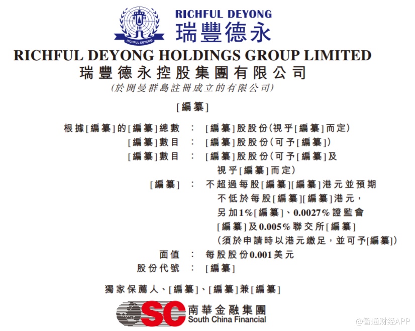 智通财经APP获悉,据港交所披露,3月25日,瑞丰德永控股集团有限公司向港交所递交上市申请,南华金融集团为其独家保荐人。