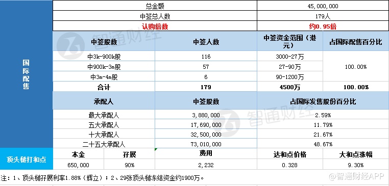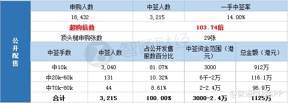 其中,公开配售申购人数18432,一手中签率14%,超购倍数103.74倍。