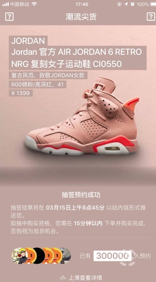 耐克也不甘示弱。3月9日上午,Jordan天猫旗舰店推出新品AJ6樱花粉运动鞋,采用抽签预约的形式。截至3月15日上午公布中签结果前,这双售价1399元的AJ6樱花粉,共吸引了37万消费者预约报名。
