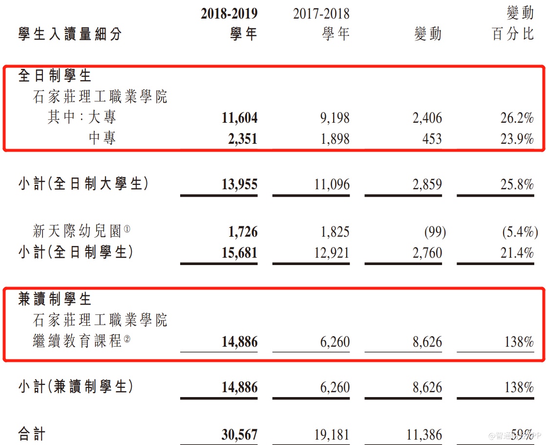 2018-2019学年,该公司的石家庄理工学院全日制学生13955人,同比增长23.9%,而该学院的继续教育课程的学生为14886人,同比增长达138%,该学院合计学生人数增加11485人,基本贡献了全部的学生增量。
