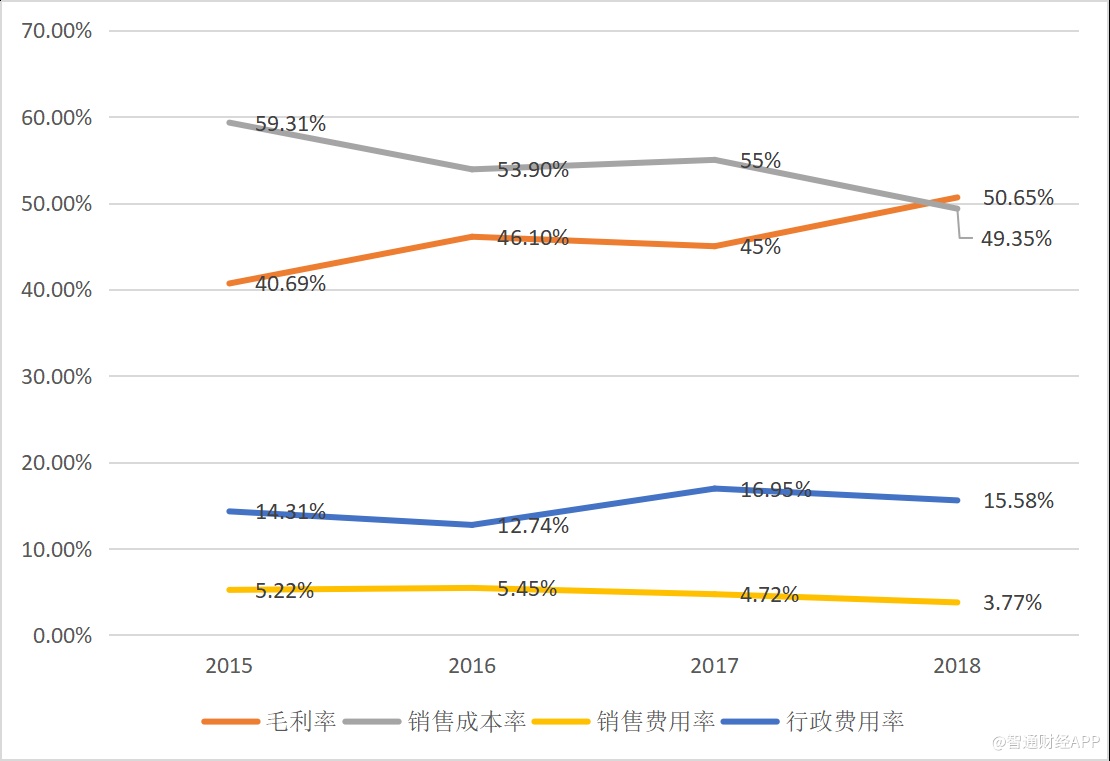 智通财经APP观察到,从往年业绩看,该公司盈利能力呈现趋势性上升,成本率以及销售费用率趋势性下降,行政费用率变化不大。比如该公司的毛利率从2015年的40.69%提升至2018年的50.65%,而销售费用率由2015年的5.22%下降至2018年的3.77%。