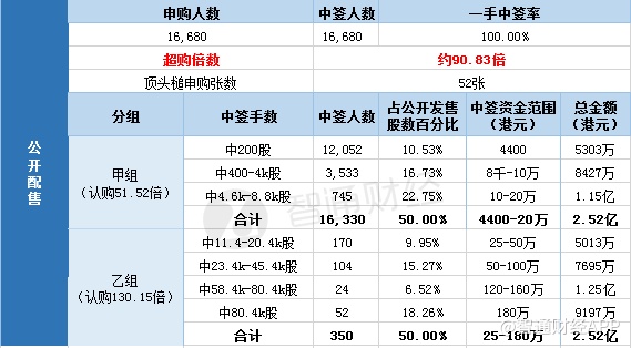 其中,公开配售申购人数16680,一手中签率100%,超购倍数约90.83倍。