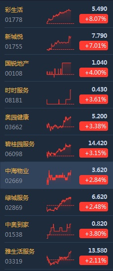 智通财经APP获悉,物业板块绩后获资金追捧,今日集体上涨,彩生活(01778)升逾8%,领涨板块。截至15时22分,彩生活涨8.07%,新城悦(01755)涨7.01%,盘中创新高。碧桂园服务(06098)涨3.15%。中海物业(02669)涨2.84%,盘中创新高。绿城服务(02869)涨2.48%。