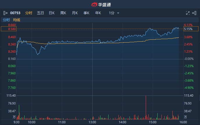 智通财经APP获悉,中国国航(00753)盘后披露业绩,尾盘升幅进一步扩大,截至15时50分,涨5.15%,报8.58港元,成交额达1.487亿港元。