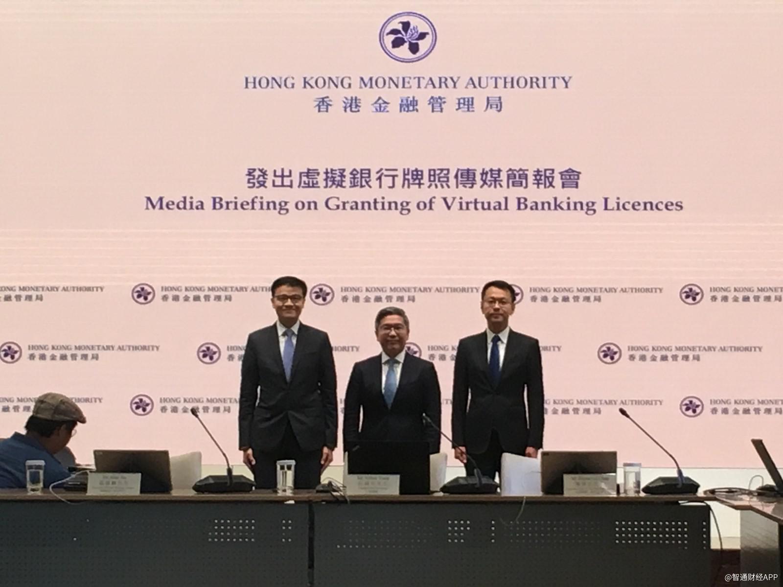 3月27日,香港金管局召开新闻发布会,公布虚拟银行发牌结果,香港金管局助理总裁(银行操守)区毓麟(下左)、副总裁阮国恒(下中)及助理总裁(银行监理)陈景宏(下右)出席了本次会议。