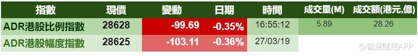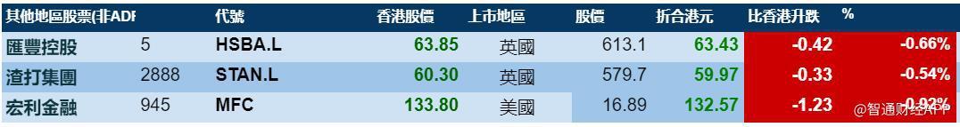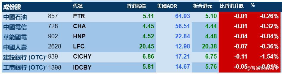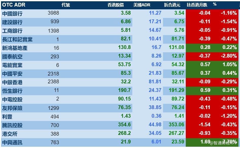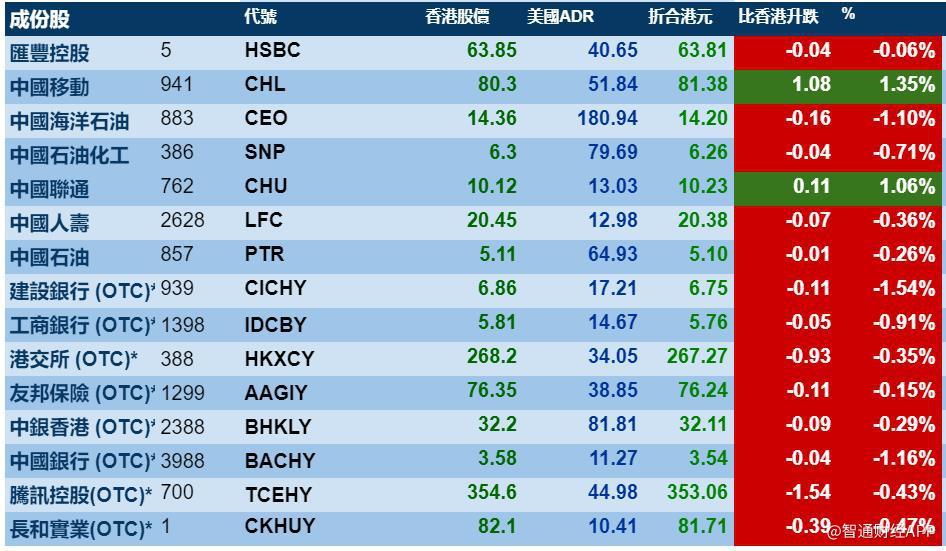 智通财经APP获悉,周三美股下跌,隔夜港股ADR也随之下跌,按比例收报28628点,跌99.69点或0.35%。其中,汇丰控股收报63.81元,较港收市跌0.04%;腾讯控股收报353.06港元,较港股收跌0.43%,中国平安报85.67元,较港市收涨0.44%。