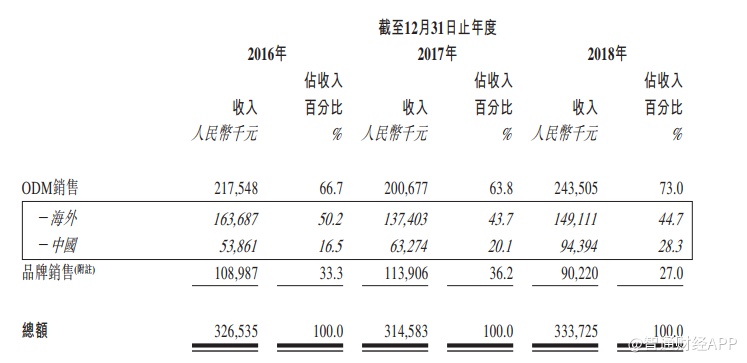 截至2018年12月31日止三个年度,该公司的收入分别约为人民币3.3亿元、人民币3.14亿元及人民币3.33亿元。截至2018年12月31日止三个年度,ODM销售所得收入分别约为人民币2.17亿元、人民币2亿元及人民币2.44亿元,分别约佔总收入的66.7%、63.8%及73.0%。