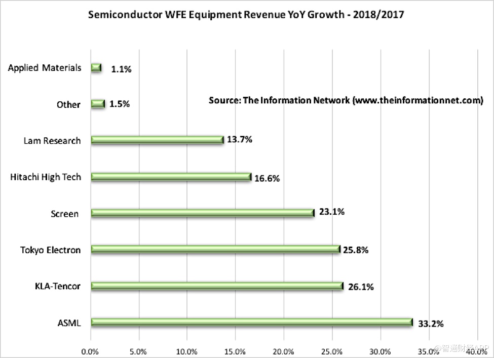 图2显示了领先半导体设备公司的收入同比变化情况。如上所述,整体市场增长了13.9%,因此拉姆研究的增长13.7%归因于其市场份额损失了0.1个百分点。应用材料于2018年增长乏力,仅为1.1%,低于排名8至75位的公司的综合增长,导致其股价下跌1.6个百分点。过去三年,该公司不敌竞争对手,市场份额持续下降。