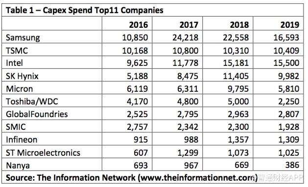 根据表1所示的资本支出数据,信息网络预测,较2018年半导体设备市场收入增长13.9%,在2019年增长将下降17%。