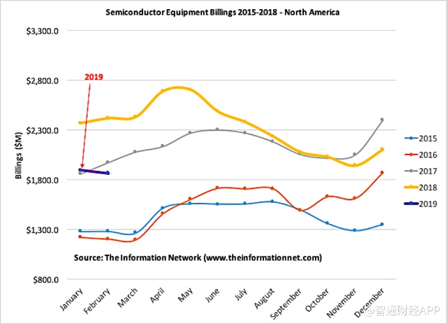 图3显示了2015年至2019年2月北美设备供应商的营收账单。红色箭头表示2019年的营收。在头两个月,2019年营业账单似乎呈季节性趋势,与2015年和2016年相仿,但比2018年同比下降21.5%。