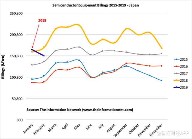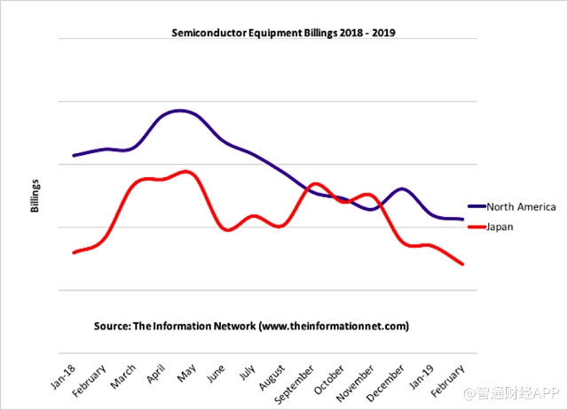 为了更好地区分北美和日本的设备公司,图5显示了2018年1月至2019年2月之间过去14个月的营收账单数据。